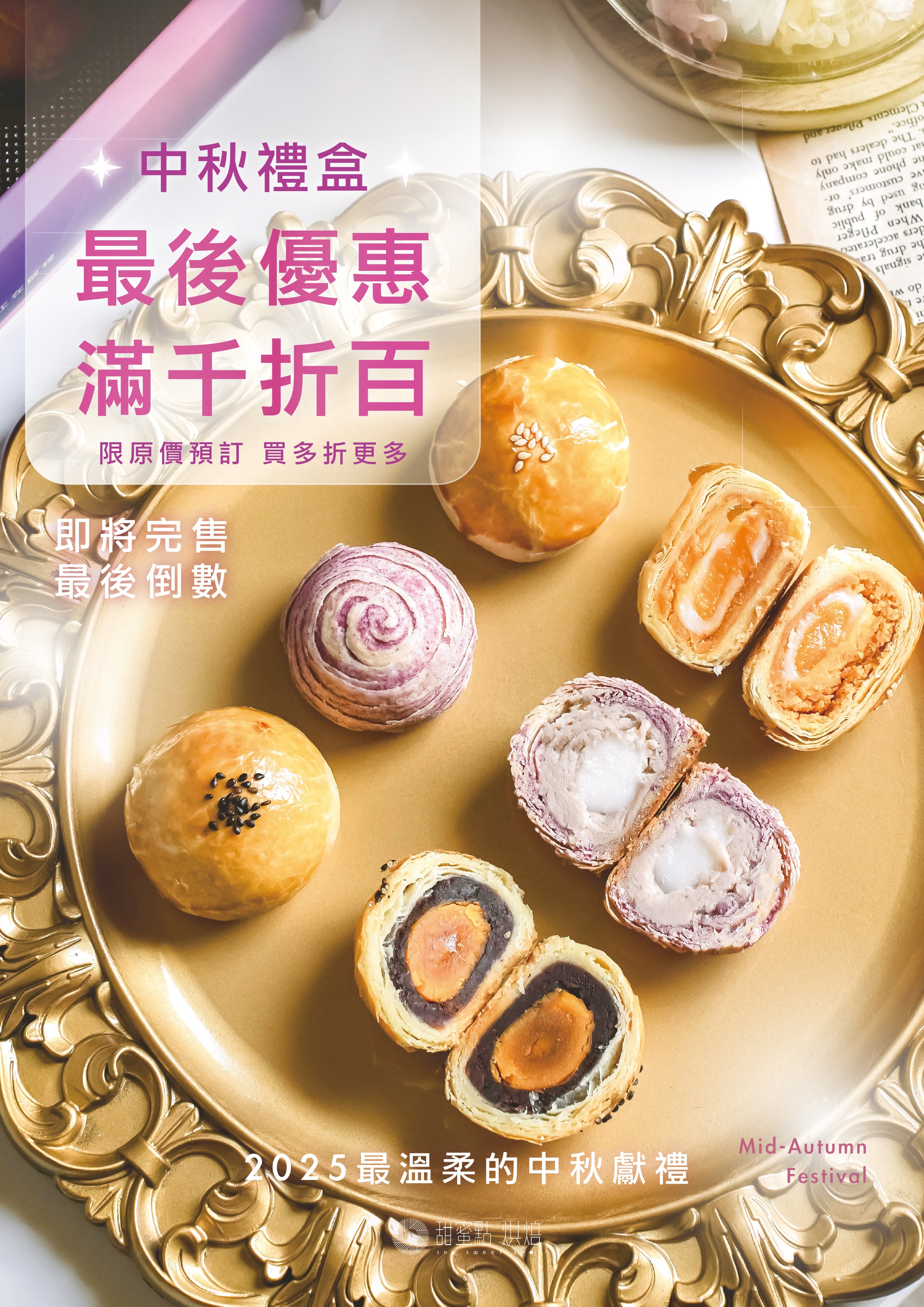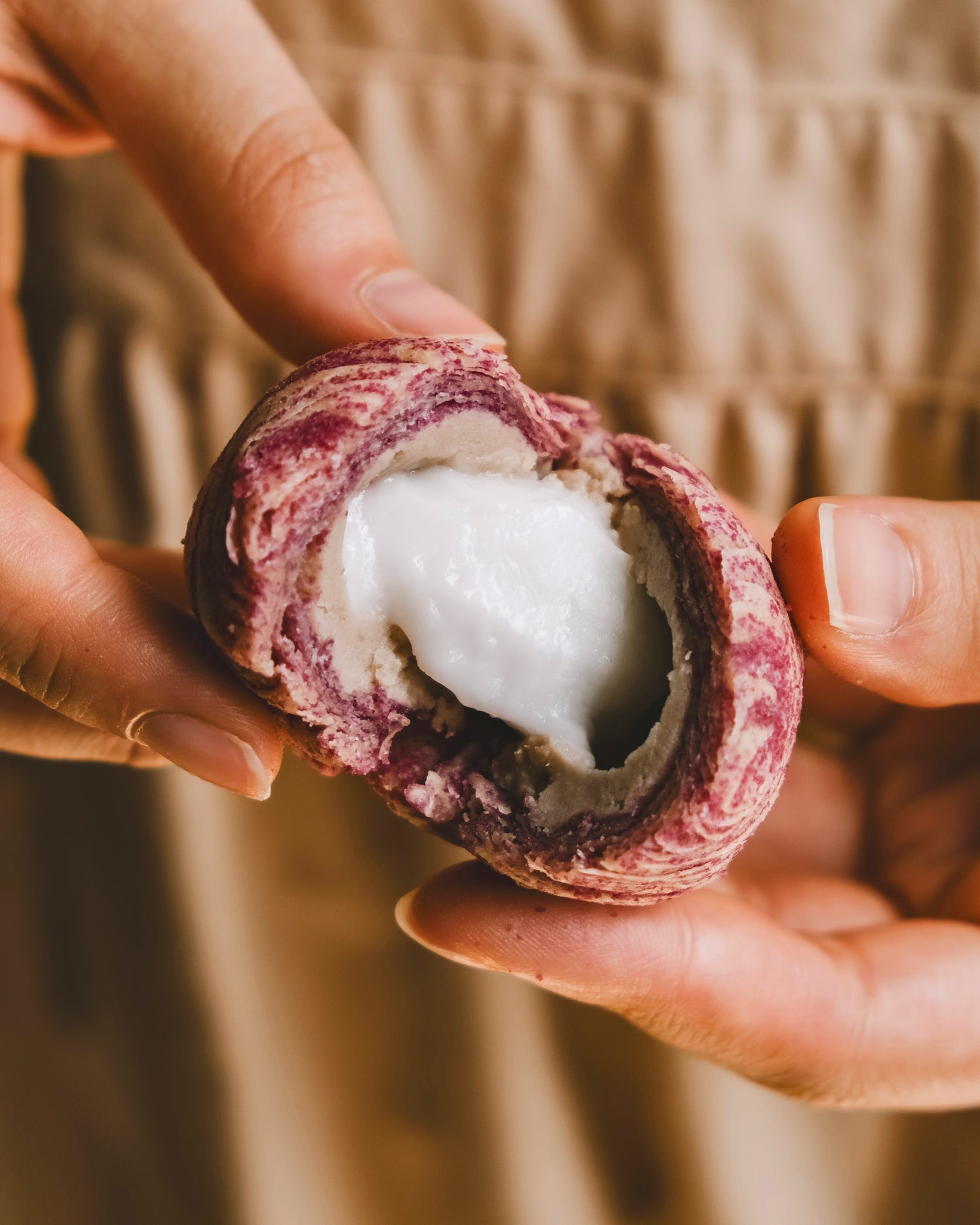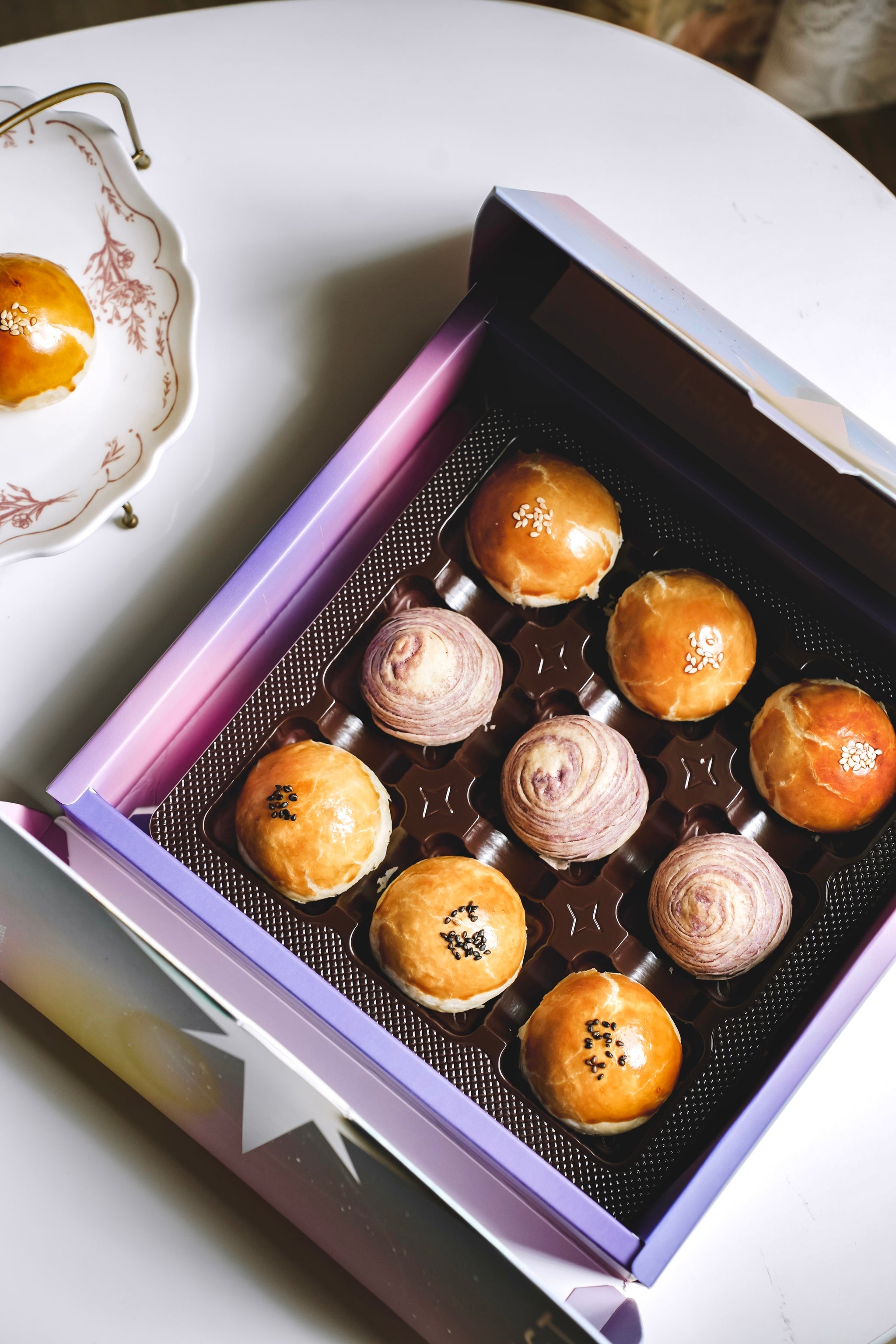 大甲整顆芋頭加入蜂蜜熬製餡料,餅皮使用天然紫薯製作,外觀清雅大方經過師傅多次實驗,替手作白玉研究出烘烤後保持Q彈的最佳配比.讓您一咬驚奇、口口定情。