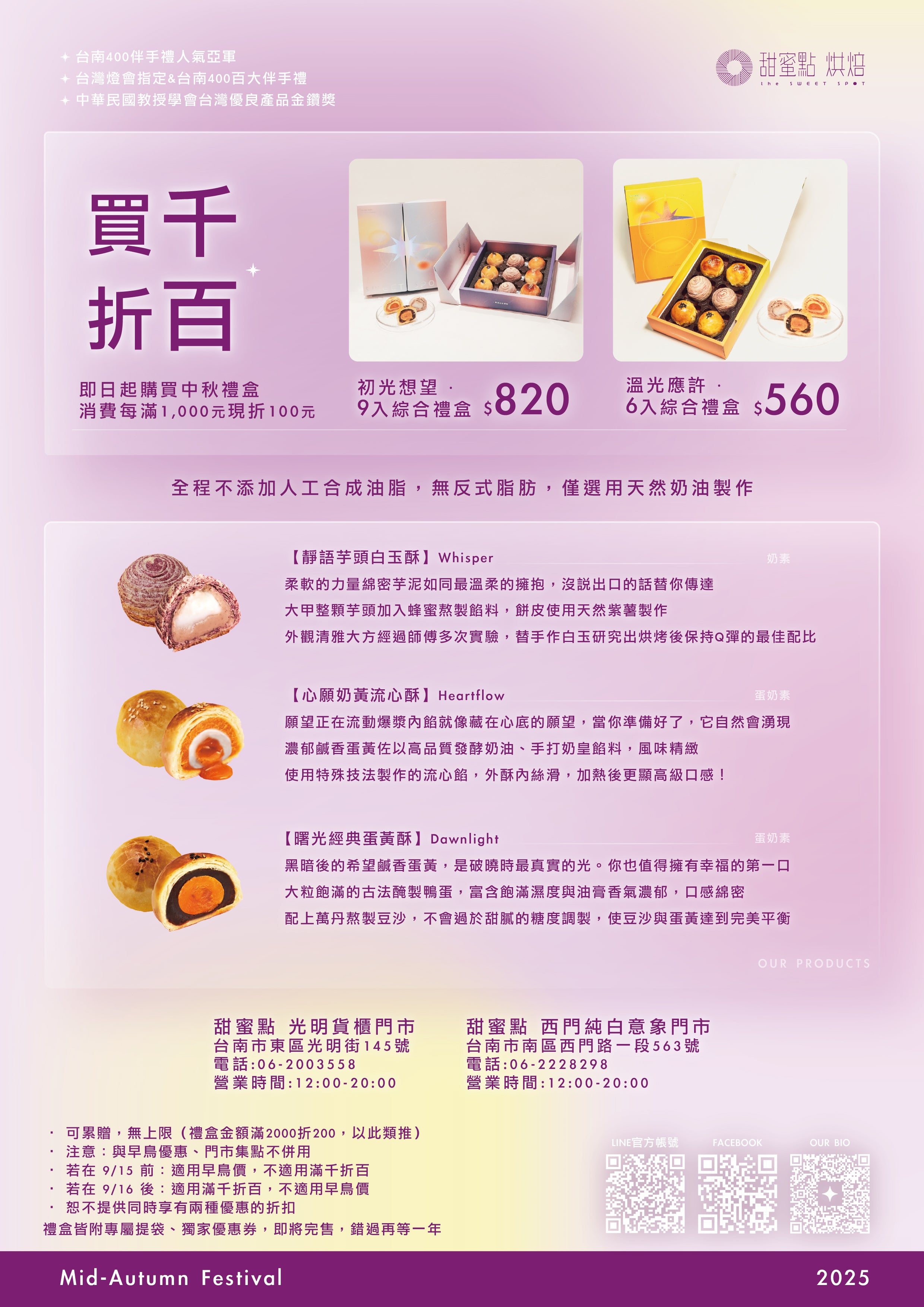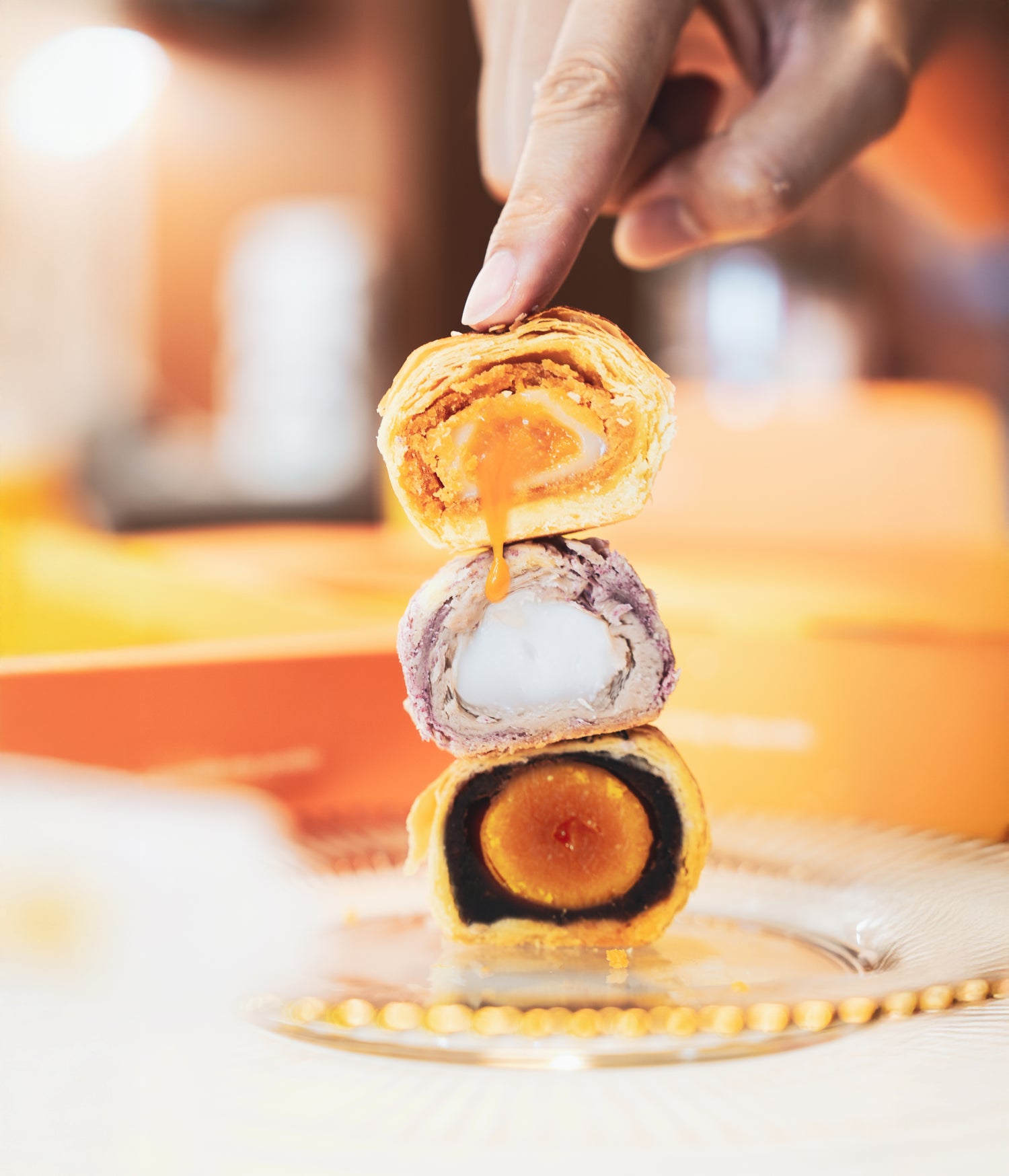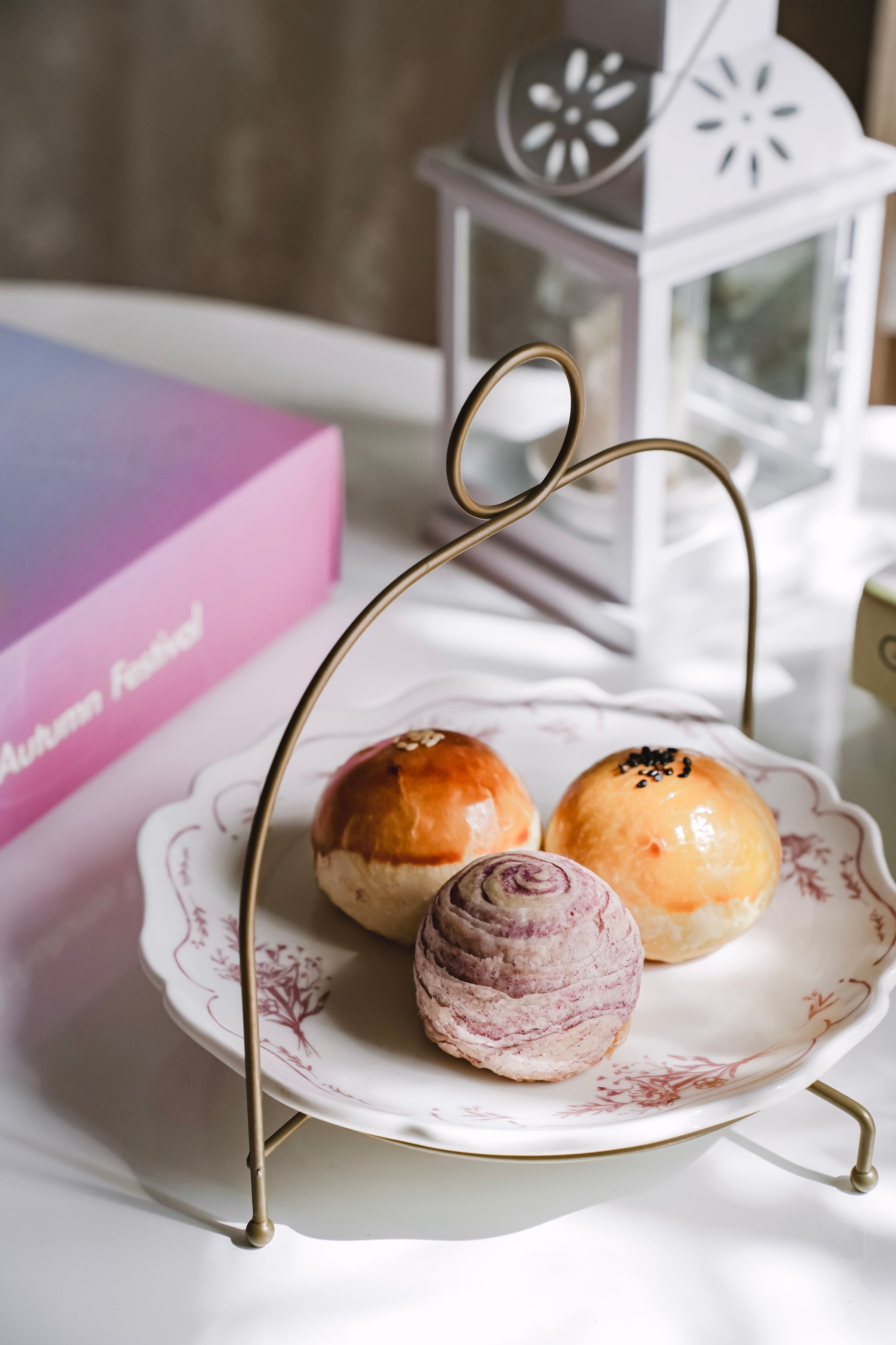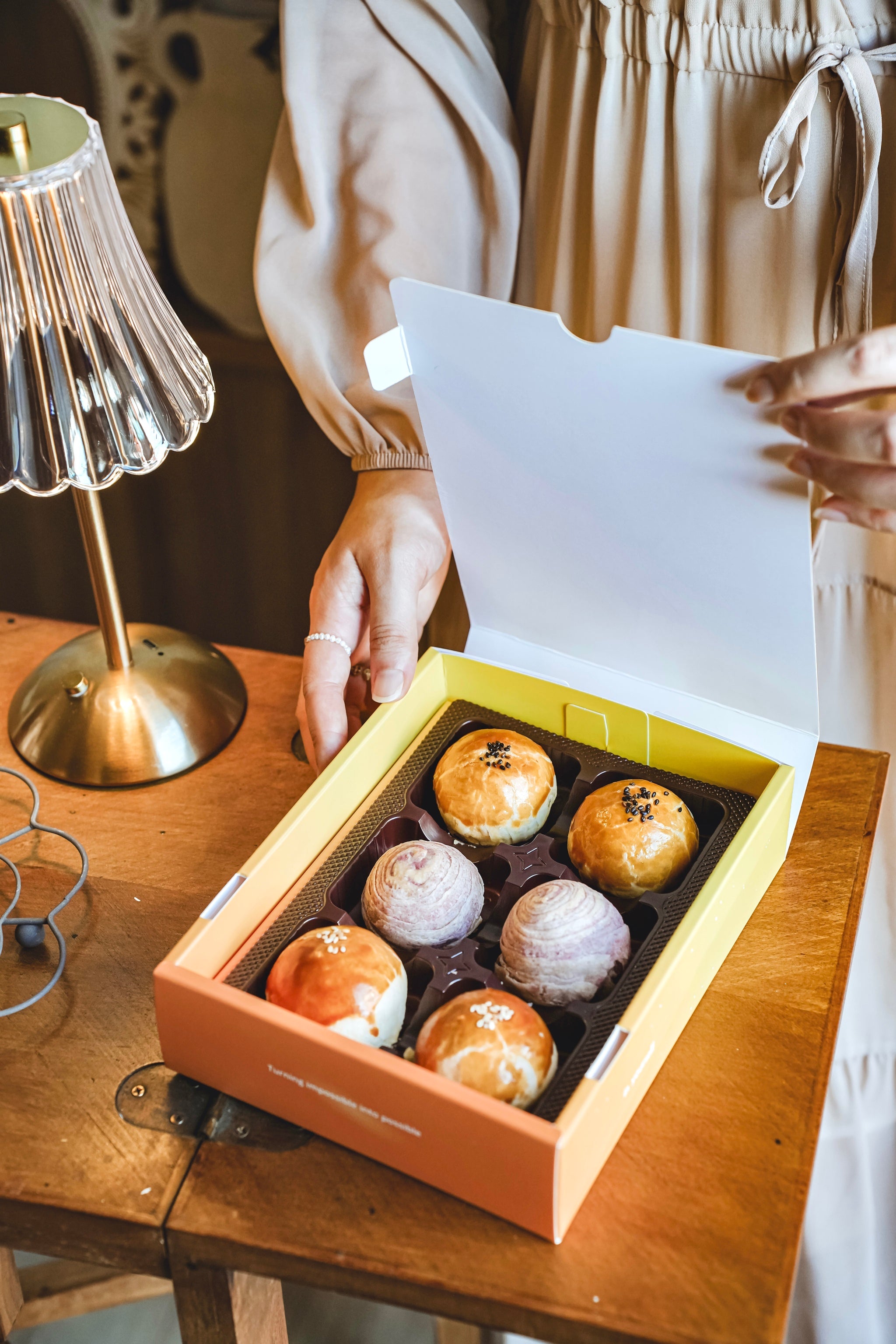 大甲整顆芋頭加入蜂蜜熬製餡料,餅皮使用天然紫薯製作,外觀清雅大方經過師傅多次實驗,替手作白玉研究出烘烤後保持Q彈的最佳配比.讓您一咬驚奇、口口定情。